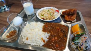 内容は、牛乳、ゆで卵、酢の物、コロッケ、サラダ、ご飯&カレー、福神漬け&ラッキョウ。