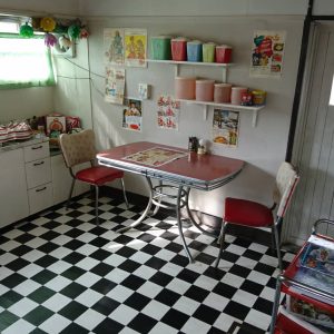 キッチン。この床は当時のものなのかな? わかりませんが、ポップで可愛いです。